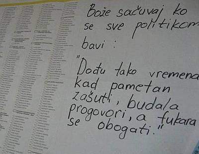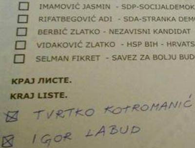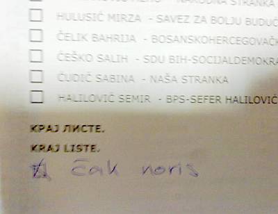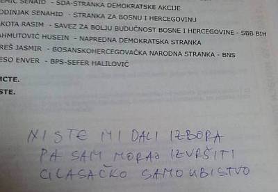 „Niste mi dali izbora pa sam morao izvršiti glasačko samoubistvo“, „I'm Batman, materi vam metnem“, „Nećemo da živimo u Avganistanu“, samo su neke od poruka koje su građani BiH ispisivali po glasačkim listićima, na, u nedjelju, održanim lokalnim izborima. Glasalo se za Edina Džeku, Tvrtka Kotromanića, Chuck Norrisa, citiralo Ivu Andrića, a takve, namjerno poništene listiće postavljalo se na Facebook profile. Na ovom mjestu pogledajte neke od najmaštovitijih građanskih iskazivanja prezira prema bosanskohercegovačkoj političkoj sceni