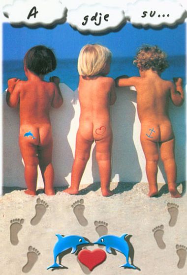 Dobro je, vi koji ste ostali izvolite pročitati, što će nas svaki tupan ometat. Razglednica, daklem, silo neč'sta. Ima jedna totalno neukusna i besmislena, s troje male gole dječice, okrenute leđima i još nekakvim glupim nadodanim tekstovima. Užasna razglednica, odavno još mislim o njoj nešto napisat, ali eto, danas ću - nikad ću i ...