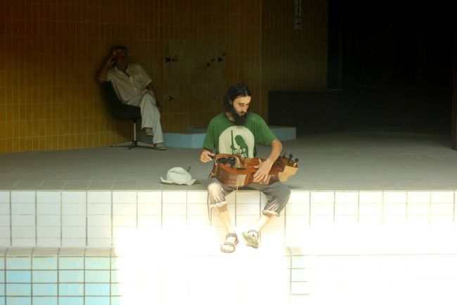 Hurdy-gurdy je, inače, žičani instrument na kojem se instrument proizvodi trenjem valjka s ručicom ispod žica, a ovoj minimalističkoj predstavi obol je dalo četvero butoh-plesača koji 'zamrznuti' u figurama prelaze s kraja na kraj bazena. Iluzija zaustavljanja vremena nastavlja se i na svršetku – tišina je potrajala dobru minutu i tek nakon toga se prolomio aplauz. A sa svjetlima, uočavamo i violinisticu Anu Kravanju kao sastavni dio izvođača, stopljenu na suhom.