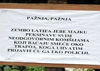 Vjerojatno ste se do sada susreli s dobrosusjedskim i ljudskim odnosima u ovim našim krajevima, ili bolje rečeno s fotografijom natpisa "mamu ti jebem lopovsku", ili čak s onom još maestralnijom gdje Latifa Zembo "jebe majku peksinavu svim neodgovornim komšijama". No, ako ipak niste vidjeli tu ljubaznost, onda je možete pogledati pod