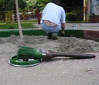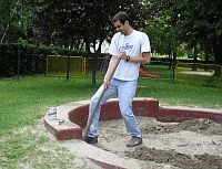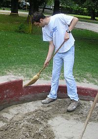 Kada sam shvatio koliko nam znače djeca i čim sam čuo za otpalu farbu s dječjeg pješčanika u zagrebačkim Ravnicama, odlučio sam reagirati i pomoći na bilo koji način. Bez ikakvih pitanja, osim gdje ću se presvući i zašto je takav mrak u podrumu, uzeo sam lopatu, metlu, farbu i četku, te krenuo na posao. I inače se uvijek rado odazivam sličnim projektima gdje uz vrlo malo uloženog truda nekom možete uljepšati život, a u ovom slučaju uljepšat ću i upotpuniti odrastanje djeci iz ovog kvarta. – izjavio nam je to na licu mjesta naš iksx@lupiga.com, a mi smo odlučili kako s takvim velikodušnim potezom treba upoznati, kako domaću, tako i stranu javnost, te smo uzeli fotoaparat u ruke i odlučili ovjekovječiti uloženi trud našeg šarmantnog kolege.
