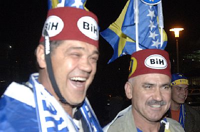 Kad smo već kod posebnih navijačkih rekvizita, ova dvojica "fesdžija", koja su na fesove priljepile automobilske zastavice i automobilske oznake BiH, otišla su daleko naprijed u odnosu na sve ostale navijače.