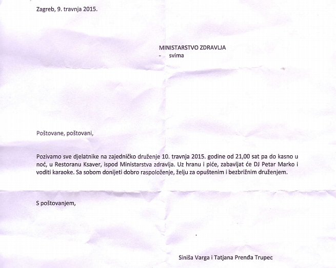 "Pozivamo sve djelatnike na zajedničko druženje 10. travnja 2015. godine od 21 sata pa do kasno u noć, u restoranu Ksaver, ispod Ministarstva zdravlja. Uz hranu i piće zabavljat će DJ Petar Marko i voditi karaoke. Sa sobom donijeti dobro raspoloženje, želju za opuštenim i bezbrižnim druženjem", stoji u pozivu koji je 9. travnja upućen svim zaposlenicima MZ-a.