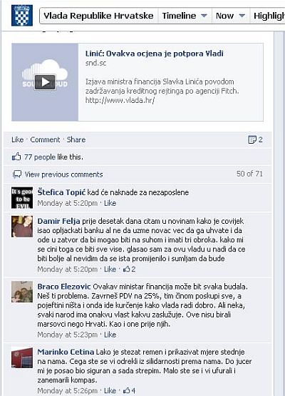 Na facebook profilu Vlade Republike Hrvatske nestalo je unisone podrške kakvu je Kukuriku koalicija uživala na početku svog mandata. Iz dana u dan na facebook statuse i linkove koje u ime Vlade ostavljaju volonteri zaduženi za održavanje socijalnih mreža posjetitelji ostavljaju sve ogorčenije komentare. Osim anketa koje pokazuju da Vlada polako, ali sigurno gubi podršku građana, nezadovoljstvo ljudi iskazano na facebook profilu Vlade također se može uzeti kao pouzdan znak da građani Hrvatske gube strpljenje i sve manje vjeruju da su Milanović, Čačić, Linić i društvo izabrali pravi politički smjer za izvlačenje Hrvatske iz nemoguće situacije u kakvu ju je gurnula pljačkaški nastrojena Hrvatska demokratska zajednica.
