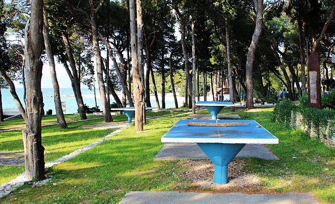 Između paviljona s dugim terasama, na 50-ak metara udaljenosti jedan od drugog, u okoliš su uklopljene moderne skulpture neobičnih oblika, među koje je zalutala i jedna postratna Gospa. Prolazite pokraj lječilišta napravljenog za rehabilitaciju radnika Plive i idete prema obali. Prije nego izbijete na more, morate proći pored betonskih stolova za stolni tenis, košarkaškog igrališta, dječjeg igrališta...