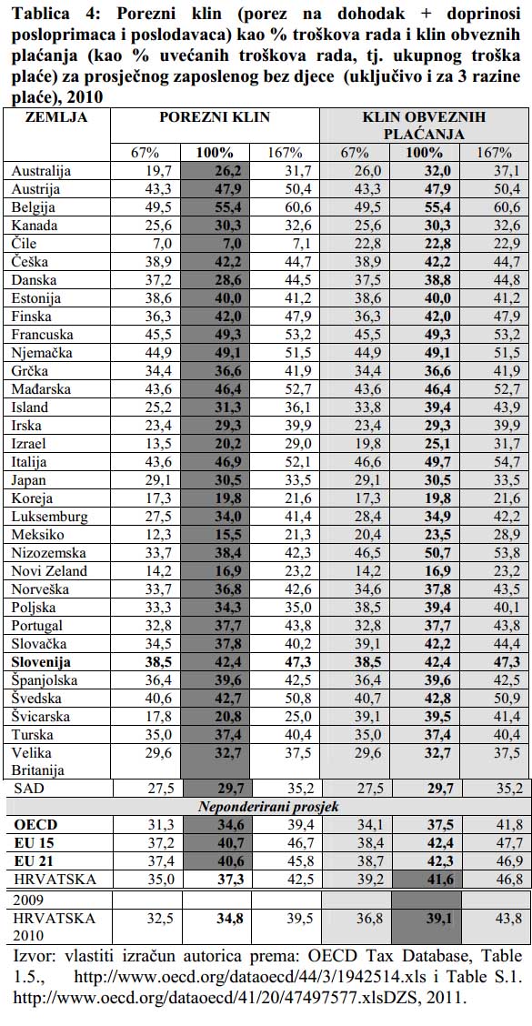 "Uvođenjem alternativne metodologije OECD-a, koja osim poreza u širem smislu obuhvaća i sva ostala neporezna obvezna davanja omogućuje realniju usporedbu i određivanje položaja RH. Vidljivo je da je temeljem najnovije metodologije opterećenje RH ispod onoga u starim članicama EU, kao i u starim članicama EU uvećanim za nove članice EU koje su istovremeno i članice OECD-a, ali je nešto više od prosjeka za sve zemlje članice OECD-a. Razlog tome je niže opterećenje neeuropskih članica OECD-a. Usporedba s ostalim članicama EU koje nisu članice OECD-a (kao i balkanskim državama) također ne ističe Hrvatsku kao najviše porezno opterećenu", zaključuju autorice u znanstvenom radu Međunarodna usporedba poreznog opterećenja radne snage: Utjecaj nove metodologije na položaj Hrvatske.