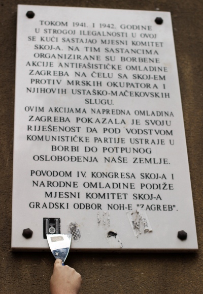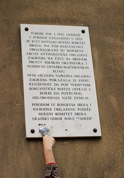 Nekoliko elegantnih poteza i sličice su nestale sa spomen ploče postavljene na zgradu u kojoj su sastanke održavali mladi zagrebački ilegalci. Na ovom mjestu doživjeli smo i blizak susret s mladićem u najboljim godinama, koji nam je uputio konstruktivan prijedlog u obliku prijekornog pitanja: "Kaj, sad ćete tu staviti zvijezdu?" (FOTO: Lupiga.Com)
