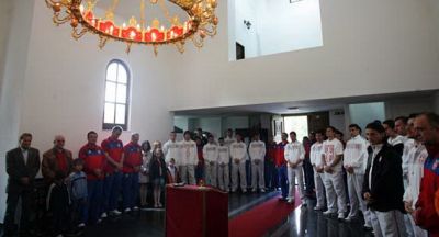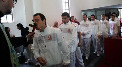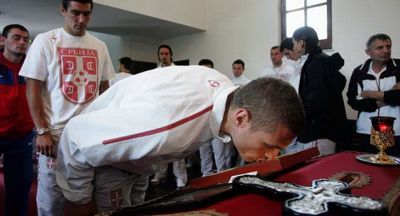 Celivanje Orlova drvenim krstom: Nogometaši Srbije u crkvi Sabora Srba svetih, srpski Johanesburg, jun 2010.