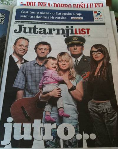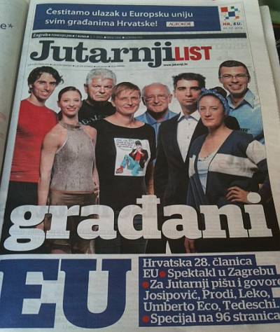 Na dan ulaska Hrvatske u Europsku uniju urednički kolegij Jutarnjeg je ipak pomalo iznenadio. Očekivano, još jednom su ponovili isti naslov – „Dobro jutro građani EU” – ali ovaj put su to učinili na čak tri naslovnice. Naime, na naslovnoj stranici maštovito su napisali „Dobro...”, na sljedećoj „jutro..”, a na trećoj „naslovnici” - „građani EU”. Međutim, ovaj put se nisu poslužili plavom podlogom sa žutim zvjezdicama, niti fotografijom premijera Zorana Milanovića, ali barem su po prvi puta objavili istinit naslov, jer građani Hrvatske tek su od danas uistinu građani Europske unije. Sasvim prigodno znamo li da dolazi iz kuhinje čovjeka koji govori da svjedočimo „genijalnoj medijskoj revoluciji“, a da smo od kreativne klase postali konzumeristička vojska … Hvala nebesima da ovaj naslov više neće moći koristiti ...
