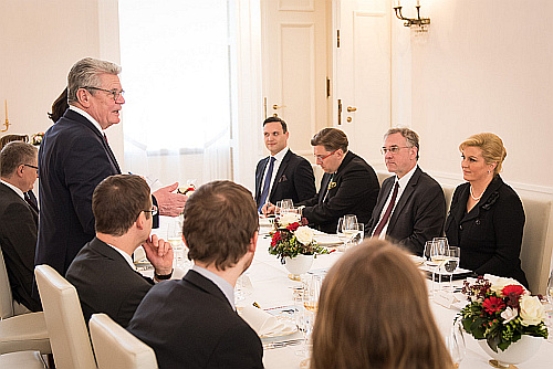 I suradnja mnogih njemačkih i hrvatskih gradova pokazuje isprepletenost društava. Ljudi u našim zemljama, pogotovo mladi, zanimaju se jedni za druge. Kakva sjajna početna pozicija za njihovu zajedničku budućnost u našoj Europi! No, točno je i ovo: ne smijemo se odmarati na račun dosad postignutog. Moramo ostati otvoreni i znatiželjni, uvijek spremni na dijalog. Stoga sam sa zahvalom primio na znanje i činjenicu da ste već na samom početku Vašeg mandata izrazili podršku razmjeni naših znanstvenika kroz program Zaklade Alexander Von Humboldt. Štoviše, veseli me što tijekom vašeg predsjedničkog mandata na hrvatsko-njemačke odnose želite staviti poseban naglasak.