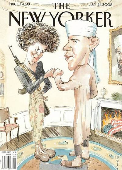 The New Yorker je 2008. godine objavio karikaturu budućeg predsjednika Države, Baracka Obame, obučenog u, prosječnom Amerikancu, neželjenu tradicionalnu muslimansku odjeću. Dok u kaminu gori američka zastava, na zidu visi slika Osame bin Ladena, Barackova supruga nosi kalašnjikov. Dovoljno provokativno?