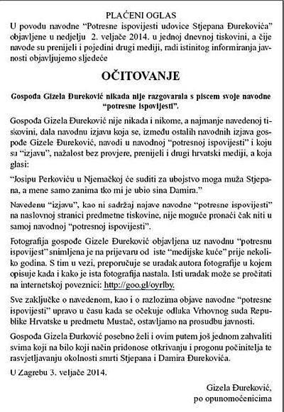 Međutim, Đurkovićeva udovica u plaćenom oglasu objavljenom u Večernjem listu po opunomoćenicima, daje na znanje: "Gospođa Gizela Đureković nije nikada i nikome, a najmanje navedenoj tiskovini, dala navodnu izjavu koja se, između ostalih navodnih izjava gospođe Gizele Đureković, navodi u navodnoj "potresnoj ispovijesti" i koju su "izjavu", nažalost bez provjere, prenijeli i drugi hrvatski mediji, a koja glasi: "Josipu Perkoviću u Njemačkoj će suditi zbog ubojstva moga muža Stjepana, a mene samo zanima tko mi je ubio sina Damira."