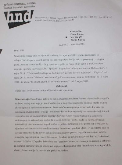 Novinarsko vijeće časti, na sjednici održanoj 14. siječnja 2011. godine, razmatralo je zahtjev Đure Capora, koordinatora inicijative Srđ je naš, za pokretanje postupka protiv Antona Hauswitschke zbog sljedećih tekstova o golfu na Srđu objavljenih u Dubrovačkom vijesniku i na portalu Dubrovacki.hr:
