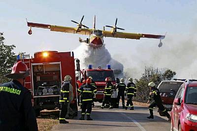 Peroj, 17.07.2012. - U 15:45 dojavljeno je da gori požar na cesti Peroj prema Barbarigi (preko puta Dragonere). Na požar koji je zahvatio oko 10 hektara izišli su JVP Pula te DVD Peroj, Vodnjan, Pula i Medulin. U gašenju je sudjelovalo 57 vatrogasaca sa 17 vozila i 2 kanadera. Na sreću životi ljudi i imovine nisu bili ugroženi. Na fotografiji kanader izbacuje vodu na vatru u neposrednoj blizini vatrogasaca. Snimio Srećko Niketić / CROPIX