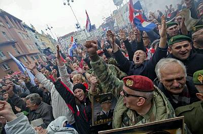 Zagreb, 16.11.2012. - Veterani domovinskog rata i građani, okupljeni na Trgu Bana Josipa Jelačića u Zagrebu, reagiraju na ukidanje presude hrvatskim generalima Anti Gotovini i Mladenu Markaču izrečenu u drugostupanjskom žalbenom postupku na Haškom sudu. Snimio Nikola Šolić
