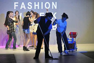 Zagreb, 12.05.2012. - Hypo centar, završna večer 18. po redu Dreft Fashion Week-a Zagreb. U tri dana predstavilo se 18 kolekcija za nadolazeću sezonu jesen-zima 2012./13. Dok su manekenke isprobavale koreografiju na svjetlu reflektora, djelatnice centra obavljale su završno poliranje piste. Snimio Srđan Vrančić / CROPIX