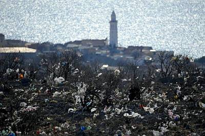 Novi Vinodolski, 01.03.2012. - Proizvodnja plastičnih vrećica je neograničena, cijena je prihvatljiva, uporaba je jednostavna. U Hrvatskoj, uporaba plastičnih vrećica nije kažnjiva ili zabranjena. Toga još nema u europskom zakonodavstvu, nedostižnom nam uzoru koji svi slijepo slijedimo bez riječi. Ako Europa strogo zabrani uporabu plastičnih vrećica (zbog slabog tržišta ili manjkavog profita) i mi ćemo ih smjesta zabraniti. Naša susjeda Italija ih je (na svoju ruku) zabranila, a mi možemo svakodnevno gledati ovakve prizore s pogledom na Novi Vinodolski čija turistička zajednica ima zgodan slogan: korak do mora, dva do snijega. Novi slogan mogao bi uskoro glasiti: korak do mora - dva do smetlišta. Snimio Romeo Ibrišević