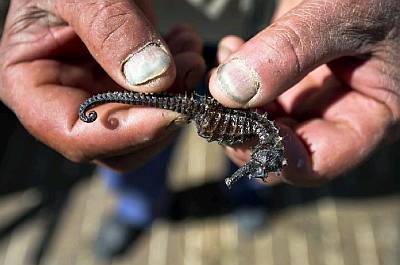 Vrsar, 18.04.2012. - Ribar u Vrsarskoj luci pokazuje osušenog morskog konjića koji se slučajno našao u njegovoj mreži. Zaštićena je vrsta u Hrvatskoj ali bez obzira na to nerijetko se može naći na štandovima prodavača suvenira. Snimio Stipe Surać