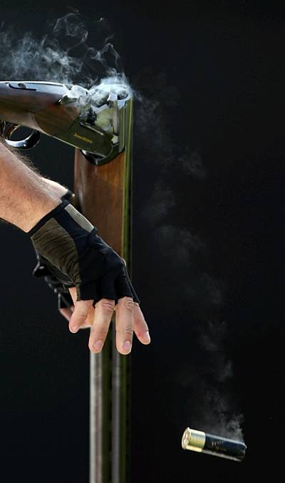 London, 06.08.2012. - Hrvatski strijelac Giovanni Cernogoraz (30) senzacionalno je osvojio zlatnu medalju na Olimpijskim igrama u Londonu u disciplini trap, dok je naš drugi predstavnik u finalu Anton Glasnović osvojio šesto mjesto. Na slici Giovanni Cernogoraz baca čahuru iz puške. Snimio Damir Senčar / HINA