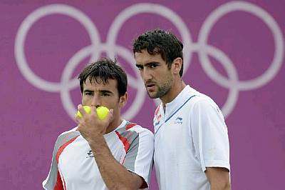 London, 30.07.12. - Hrvatski par u tenisu Marin Ćilić i Ivan Dodig dogovaraju se između dva poena tijekom Olimpijskih Igara u Londonu. Snimio Drago Sopta / CROPIX