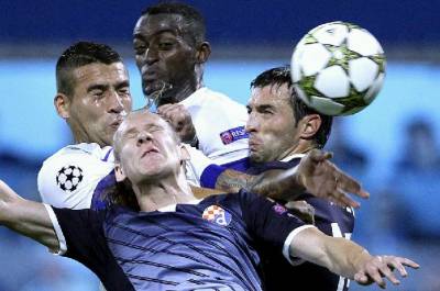 Zagreb, 18.09.2012. - Nogometna utakmica 1. kola UEFA Lige prvaka. GNK Dinamo - FC Porto 0-2. Domagoj Vida, Nicolas Otamendi, Tonel i Jackson Martinez u skoku nakon kornera. Snimio Goran Stanzl / PIXSELL