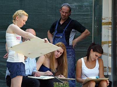 Split, 11.05.2012. - Pjaca, radnik na obližnjoj zgradi gleda kako strane studentice umjetničke škole napreduju sa crtanjem Pjace i grada. Snimio Veljko Martinović