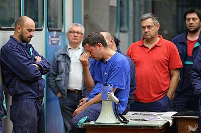 Zagreb, 16.03.2012. - Peti dan štrajka radnika tvornice Dioki. Radnici od srijede blokiraju željezničku prugu, odnosno industrijski kolosijek na kojem se nalazi 36 cisterni sa OMV-ovom naftom koja čeka na pretovar u Janafove spremnike. Štrajkači poručuju vlasniku koji želi doći do cisterni Janaf-a da neće biti nikakvih aktivnosti dok se ne ispune njihovi zahtjevi od koji je između ostalih i pet neisplaćenih plaća. Danas poslijepodne su angažirani zaštitari kako bi osposobili za promet industrijski kolosijek. Snimio Ronald Goršić / CROPIX