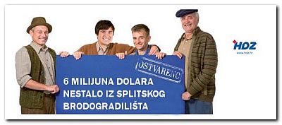 Iako autori ovih plakata nisu poznati, u Hrvatskoj demokratskoj zajednici će zasigurno reći kako je to (ne)djelo crvenih vragova. Naravno ne onih iz Manchester Uniteda, nego onih iz SDP-a, koji su se zaigrali s njihovim spektakularnim plakatima u kojima je, čini se, sva pozornost usmjerena kritiziranju drugih. Kako god, nepoznati birač ironizirajući HDZ-ov program i način predizborne kampanje osvrnuo se na aferu sa splitskim brodogradilištem, Hrvatskim fondom za privatizaciju, gradnju mosta Pelješac, aferu u HAC-u, kazneni zakon u slučaju lakih droga ... Uostalom pogledajte i sami ...