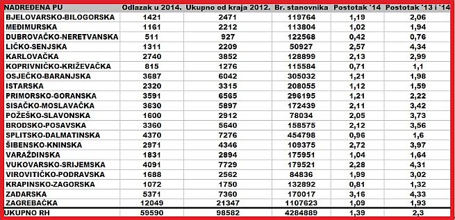 Podaci koje su nam ustupili - a odnose se na ukupan broj prijava odlaska od kraja 2012. godine do danas te broj onih koji su lani zatražili reguliranje odlaska u inozemstvo - govore o tome da je 2,23 posto građana Hrvatske prijavilo svoj odlazak iz države u zadnje dvije godine. Pridružili smo im broj stanovnika županija za koje su dotične PU nadležne, kako bi se bolje razumjelo stanje s iseljavanjem, kao i udio koji broj iseljenih u 2014. godini čini u ukupnom broju stanovnika županije.