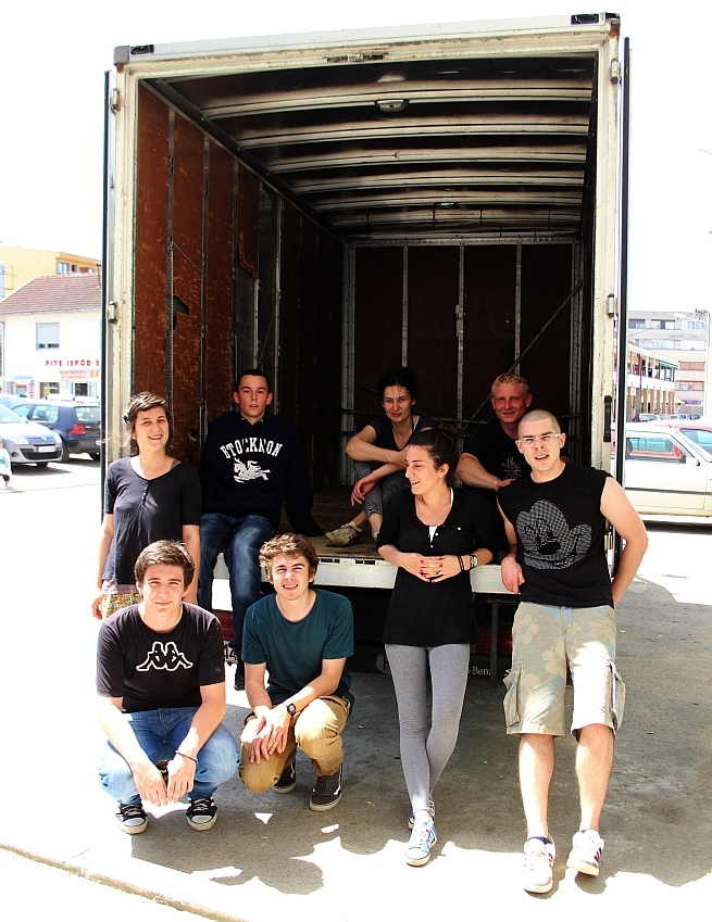 8.30 Utovarena je gotovo sva hrana! Prebacivanje kutija u kamion je, naravno, najlakši uz pomoć formiranja lanca. Neke su kutije bile stvarno teške jer, primjerice, sadrže više desetaka konzervi graha. "Oooo, ovo je lagano k'o pero!", čuje se povremeno uzvik olakšanja. Kutija s pelenama je iz minute u minutu sve atraktivnija za nošenje.