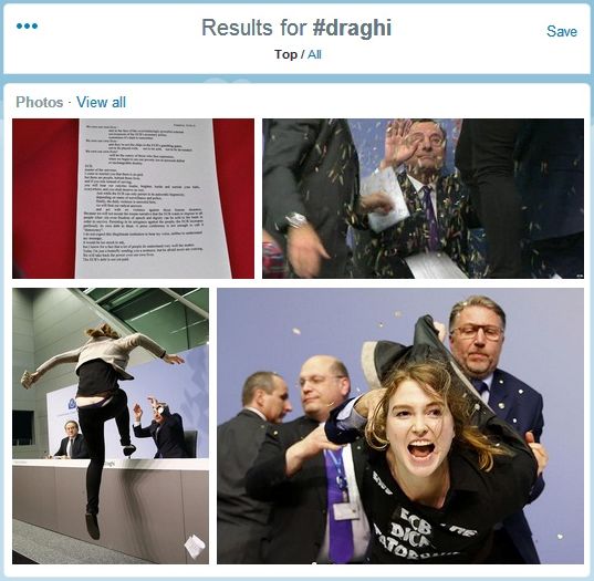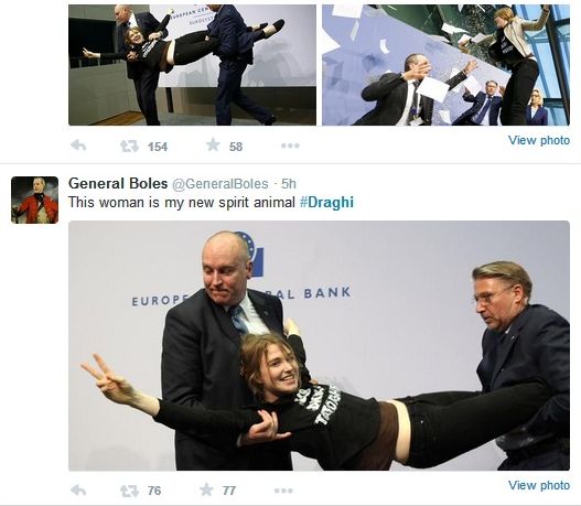 Dok su prosvjednicu agenti sigurnosti ščepali za ruke i noge i odvukli je, ona se nasmiješila i pokazala znak pobjede. U policijskoj postaji u Frankfurtu provela je dva i pol sata, a prema policijskim izvorima radi se o 21-godišnjoj djevojci Josphine Witt iz Hamburga. Draghija je zasula letcima na kojima osuđuje aroganciju i nedemokratičnost ECB-a najavljujući: "Bojte se, dolazi još ovakvih kao što sam ja! Preuzet ćemo kontrolu nad vlastitim životima. ECB još nije platio svoj dug."