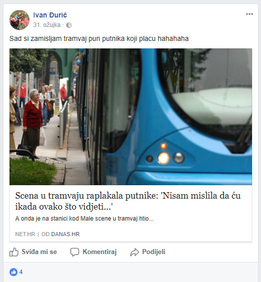 Baš šteta kaj se u tom tramvaju nije našel barem jedan muškarac koji bi mu zabio koljeno u jaja. Možda drugi put, nadajmo se.