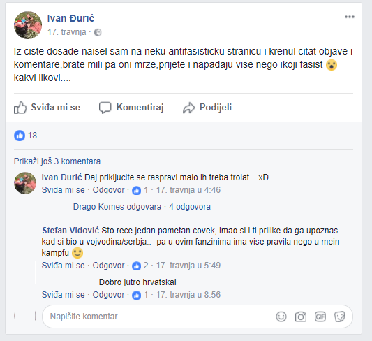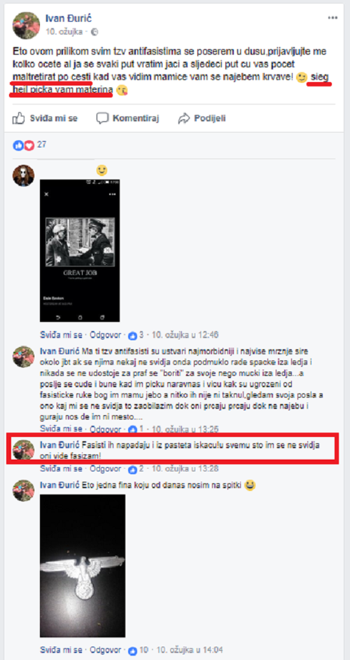 Njegov Facebook profil odaje kako se radi o "grobaru u koncentracijskom logoru Auschwitz", velikom zaljubljeniku u Wermacht, koji slavi Hitlerov rođendan i 10. travnja, nosi majice sa simbolom HOS-a, kao i one sa proslave godišnjice Oluje u Čavoglavama, te se voli fotografirati sa svojim malenim djetetom uz tenkove, oružje i slično. Ne voli javni prijevoz, konkretnije ZET (Zagrebački električni tramvaj). Kao i mnogi moderni fašistoljupci, dok nosi pepper sprej u džepu i napada ljude, tvrdi da su antifašisti - nasilni. Otvoreno im je i prijetio putem Facebooka, da bi se prijetnja materijalizirala u tramvaju pola godine kasnije i to uz poklič, koji je upotrijebio u tramvaju: "Sieg Heil, pička vam materina!" U istom statusu od 10. ožujka spominje i svoju spitku, u kojoj je viđen u tramvaju, a služi se i tipičnom argumentacijom fašista 21. stoljeća: "Fašisti ih napadaju i iz pašteta iskaču! U svemu što im se ne sviđa oni vide fašizam!".