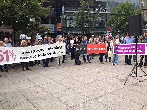 "Crkva je posebno zainteresirana za ženska tijela!", kazala je, a iz publike je "doletio" komentar: "Pa i nije baš!". U proglasu organizatora koji je pročitan na prosvjedu između ostalog je stajalo: