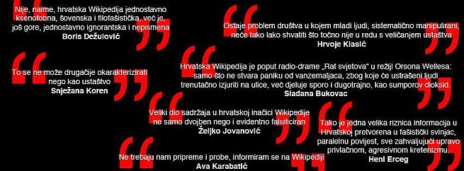 Članke na Wikipediji može objaviti svatko i tako je od njenih početaka, a tako će biti i ubuduće. Upravo je zato na Wikipediji ključna uloga administratora koji u konačnici filtriraju ono što krajnji korisnici Wikipedije čitaju. U hrvatskom slučaju uloga administratora gotovo je potpuno izostala, pogotovo što se tiče politički i svjetonazorski osjetljivih tema, tako da u tim segmentima hr.wikipedija polako prelazi iz enciklopedistike u propagandu. Problem je s hrvatskom Wikipedijom što je mnogi suradnici shvaćaju kao “oživotvorenje tisućljetnog sna”, kao nastavak borbe za samostalnost, te jako malo suradnika istinski shvaća da je hr.wikipedija samo dio većeg projekta i da Wikipedija nije “hrvatska” nego je samo na hrvatskom jeziku. To je veliki problem jer na račun međunarodnog uspjeha Wikipedije i hrvatska inačica kod prosječnog građanina ima veliku vjerodostojnost, puno veću nego što bi s obzirom na trenutačne sadržaje i način prezentacije informacija trebala imati.
