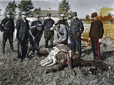 Devet francuskih vojnika znatiželjno razgleda konja ubijenog na Zapadnoj fronti