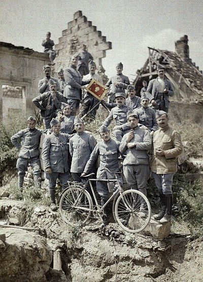 Francuski oficiri iz 370. pješačke regimente poziraju pred ruševinama nakon njemačkog napada na Chemin des Dames blizu Reimsa. Ova regija bila je jedno od najgorih ratnih područja Zapadne fronte tijekom Prvog svjetskog rata.