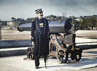 Vojnik u uniformi i tri medalje na prsima stoji kod topa. Fotografija je snimljena u Parizu 1918. godine. Njegova noga, kao što vidite, zamijenjena je umjetnim udom.