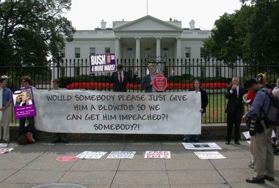 Da, točno tako. S jednim pušenjem riješili bi se brojni svjetski problemi, odnosno tako misle protestanti ispred Bijele kuće. Ideja uopće nije luda: primijeniti model Billa Clintona, žrtvovati jednu osobu za težak posao, a Bušman bi čak mogao biti i zadovoljan te sa smiješkom napustiti ovaj posao na kojem je sposoban napraviti poprilično nereda.