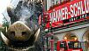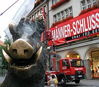 Evo i jedne foto novice izoštrene mutnim okom naše (čuj naše?) kamere. Riječ je o već spominjanoj rasprodaji pod motom Sommer Schluss Verkauf (SSV), koja je, eto, nakon dva tjedna ludovanja po njemačkim trgovinama, završila. Svakome jednom mora doći Schluss. Tužno je skinuta hrvatska zastava, dok nam je vepar s osmijehom na ružnoj njušci rekao: Schluss SSV