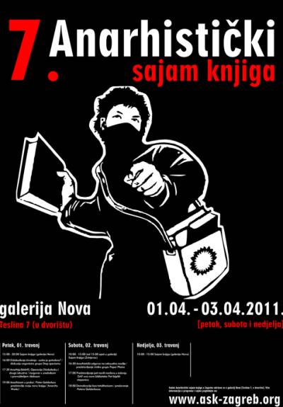 Za sedmi Anarhistički sajam knjiga određen je prvi vikend u travnju, a mjesto održavanja je galerija Nova, u Teslinoj ulici, gdje će se okupiti brojni izdavači s anarhističkim predznakom, kako iz Hrvatske, tako i iz regije i svijeta. Jedan od zanimljivijih gostiju ovogodišnjeg programa je, čest posjetitelj Hrvatske, Amerikanac Peter Gelderloos, koji će na konkretnim primjerima pokušati pokazati kako se anarhističke ideje mogu pretvoriti u stvarnost. Taj je događaj zakazan u petak, a već sutradan, u subotu, Gelderloos će održati i predavanje pod nazivom „Demokracija kao totalitarizam“.