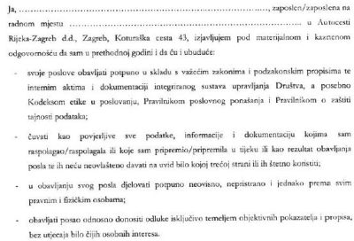 U uvodu napomenimo tek da ideja o potpisivanju jedne ovakve izjave dovoljno govori o stanju u hrvatskim javnim poduzećima. Stotinjak rukovodećih ljudi firme njome se obavezuje da neće krasti i namještati rodbini poslove, a osobito urnebesan je dio gdje potpisnici izjavljuju kako razumiju da im je jasno tko su im članovi uže rodbine. Također, zanimljivo je da je potpisnicima u obavezu stavljeno da moraju poštivati zakone i podzakonske propise Republike Hrvatske, kao da se to samo po sebi ne podrazumijeva. Doduše, javna poduzeća u godinama iza nas bila su države u državi, gdje je vladao zakon jačeg, bržeg, bolje povezanijeg, promućurnijeg, grabežljivijeg. Elem, da vas više ne davimo, jer i sami odavno znate u kakvoj zemlji živite, pogledajte integralni tekst Izjave o povjerljivosti i nepristranosti koji su početkom godine potpisivali u Autocesti Rijeka-Zagreb d.d.
