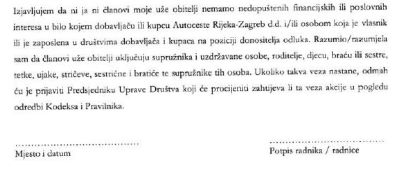 Izjavljujem da ni ja ni članovi moje uže obitelji nemamo nedopuštenih financijskih ili poslovnih interesa u bilo kojem dobavljaču ili kupcu Autoceste Rijeka - Zagreb d.d. i/ili osobom koja je vlasnik ili je zaposlena u društvima dobavljača i kupaca na poziciji donositelja odluka. Razumio/la sam da članovi uže obitelji uključuju supružnika i uzdržavane osobe, roditelje, djecu, braću ili sestre, ujake, stričeve, sestrične i bratiće te supružnike tih osoba. Ukoliko takva veza nastane, odmah ću je prijaviti predsjedniku Uprave Društva koji će procijeniti zahtjeva li ta veza akcije u pogledu odredbi Kodeksa i pravilnika.