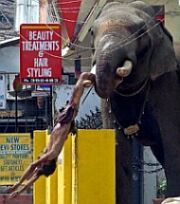 Vjerujem kako ova fotografija govori dovoljno sama za sebe, a govori o nesretnoj i nezamislivoj sudbini trenera slonova, kojem je njegov slon možda bio i najboljim prijateljem, koji je, eto, sada iznenada pobjesnio i svoju bijes iskalio na najbližem, a to je bio njegov trener. Tisuće očevidaca bespomoćno je promatralo ovu scenu, a slon je više od tri sata divljao po centru grada dok ga nisu