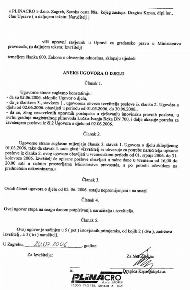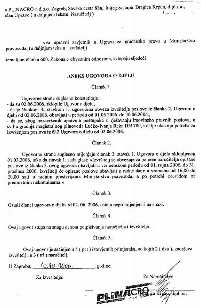 No, bez obzira na lijepe honorare, službenici Grada Zagreba, zbog obima posla, kako je navedeno u aneksu ugovora, nisu bili u stanju ispoštovati rokove navedene od 1. ožujka do 1. svibnja 2006. godine, pa je Plinacro s njima potpisao anekse ugovora u kojima ih je obvezao na nove rokove (od 1. rujna do 31. listopada 2006.). Naravno, kako je vidljivo iz ugovora, cijelo se ljeto nije radilo, iako je, podsjetimo, Plinacro ulupao nešto manje od šest milijuna kuna poreznih obveznika kako bi ubrzao cijeli proces.