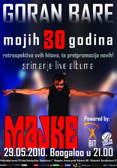 Kao pravi roker, vratio se Bare iz pritvora i poziva vas da s njim snimite lajv album. Osim što ćete se do kraja života moći hvaliti kako ste baš VI snimali ploču s najvećom facom među rokerima, imat ćete i užitak da vam Goran Bare otpjeva retrospektivu Majki. Ali kao i u pravoj reklami – ni ovo nije sve! Na koncertu u Boogaloou, koji će se održati 29. svibnja otac Majki i pradjed rokenrola u Hrvata otpjevat će i nekoliko novih pjesama koje priprema za idući album