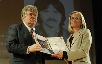 Štefica Galić, prima nagradu za građansku hrabrost "Duško Konodor", posthumno dodijeljenu njenom suprugu (FOTO: Slobodna Evropa)