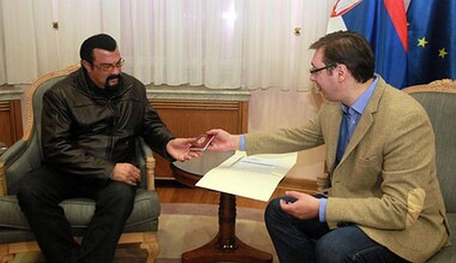 Vučić uručuje srpski pasoš Seagalu (FOTO: srbija.gov.rs)