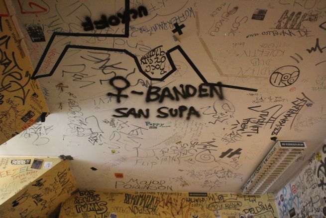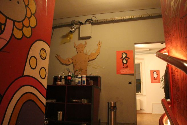 Na putu do green rooma na najvišem katu prolazimo i pokraj kino dvorane. A u green roomu dočekuje nas sve što je za takvo vrijeme i mjesto potrebno - hrana, cuga, ogroman kauč za zavaliti se i uživati dok si okružen išaranim zidovima s pozivom na anarhiju, ali i toleranciju i osvješćivanje ženske moći.