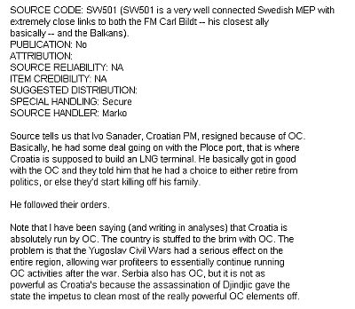 - Primijetit ćete da sam u ranijim analizama napomenuo da u Hrvatskoj apsolutno vlada organizirani kriminal. Zemlja je njime potpuno pritisnuta. Ratovi u bivšoj Jugoslaviji utjecali su na cijelu regiju, a profiterima je dozvoljeno da i nakon rata nastave voditi državu. Srbija također ima organizirani kriminal, ali on nije tako moćan kao u Hrvatskoj. Ubojstvo Zorana Đinđića, naime, Srbiji je dalo povod da očisti jake elemente organiziranog kriminala, stoji u mailu upućenom Stratforu.